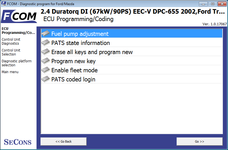 Conectați-vă la unitatea de control al motorului (PCM) de către FCOM. Funcția Reglarea pompei de combustibil poate fi găsită în meniul Programare/Codificare ECU. Selectarea oricăror alte funcții de codare, cum ar fi autentificarea PATS, cheile de ștergere etc., nu este necesară pentru reglarea pompei de combustibil.