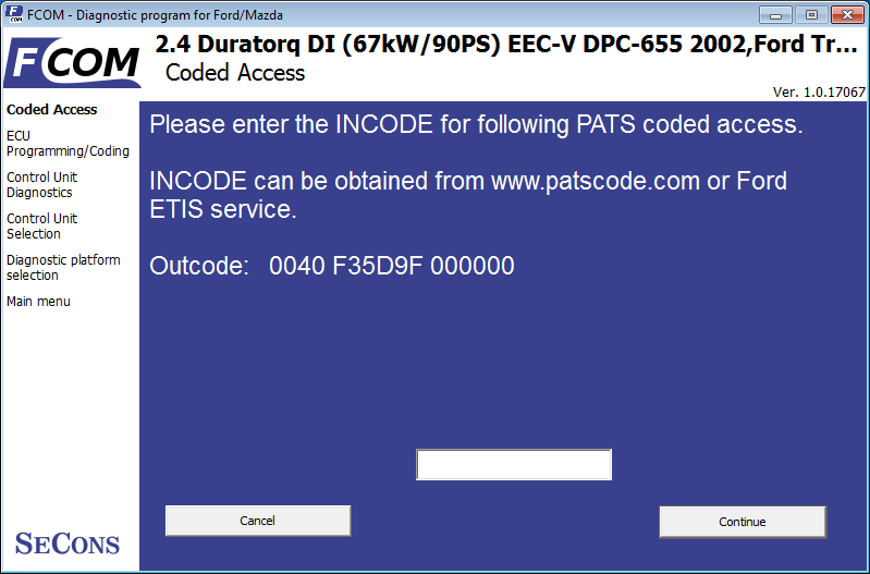 Amintiți-vă că pentru fiecare OUTCODE, pe care o generează o unitate de control, este necesar să obțineți un INCODE unic. Utilizarea unuia și aceluiași INCODE în timpul mai multor operațiuni cu PATS nu este posibilă.