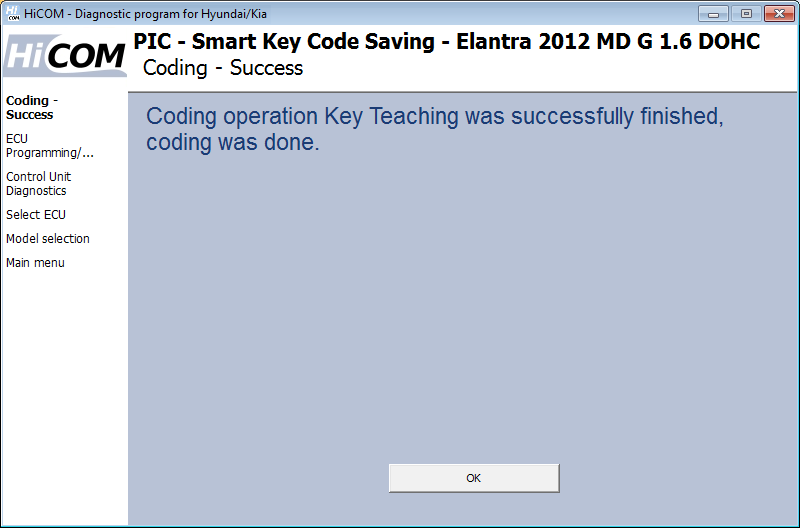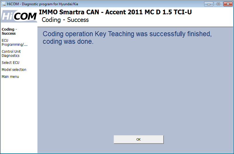 După finalizarea operațiunii de codare, HiCOM afișează informații despre codificarea reușită.