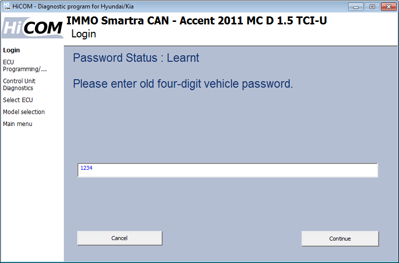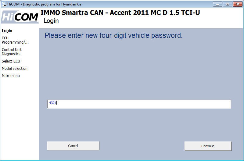 Vi se va solicita să introduceți parola dacă unitatea de control nu este „Virgin”. Parola este numerică, formată din 4 cifre zecimale (ex. 1234). În ceea ce privește unitatea de control Virgin, vi se solicită direct să setați o parolă.